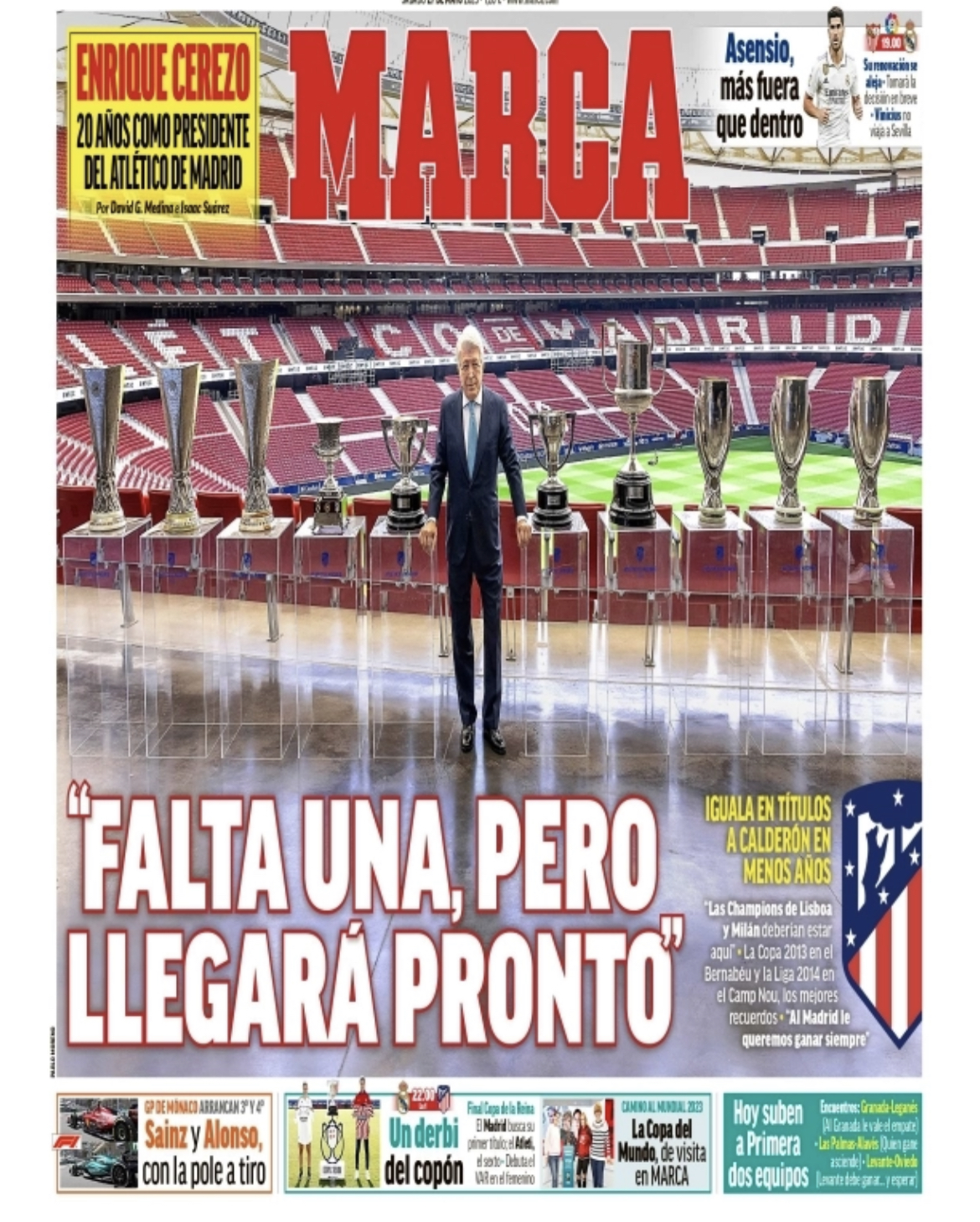 Marca publica una entrevista exclusiva a Enrique Cerezo, quien apunta, posando con los grandes trofeos del Atlético que "las Champions de Lisboa y Milán deberían estar aquí".