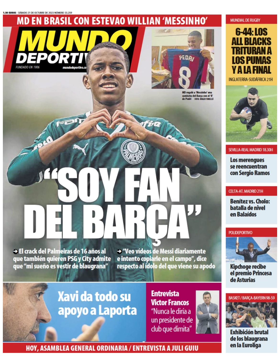 Mundo Deportivo publica una entrevista a Estevao Willian, promesa emergente del fútbol brasileño: "El crack del Palmeiras de 16 años al que también quieren PSG y City admite que su sueño es vestir de blaugrana".