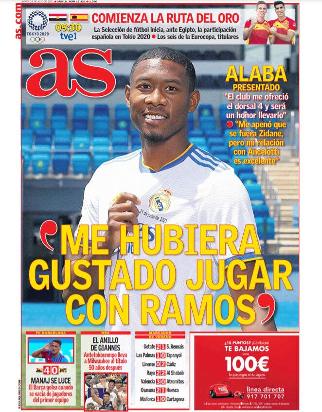 David Alaba también es protagonista de la portada de As, con varias de sus frases en la presentación como futbolista del Real Madrid: "El club me ofreció el dorsal 4 y será un honor llevarlo. Me apenó que se fuera Zidane pero mi relación con Ancelotti es excelente".