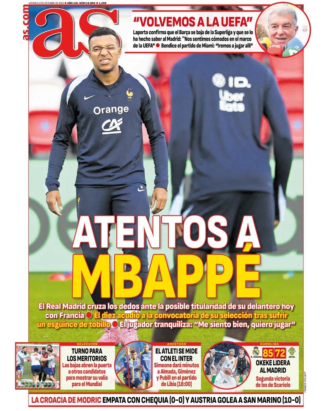 As apunta que "el Real Madrid cruza los dedos ante la posible titularidad de Mbappé hoy con Francia. El diez acudió a la convocatoria de su Selección tras sufrir un esguince de tobillo. El jugador tranquiliza".