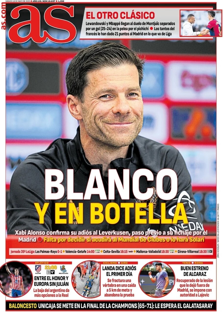 As publica en su portada que "Xabi Alonso confirma su adiós al Leverkusen, paso previo a su fichaje por el Madrid. Falta por decidir si acudirá al Mundial de Clubes o si lo hará Solari".