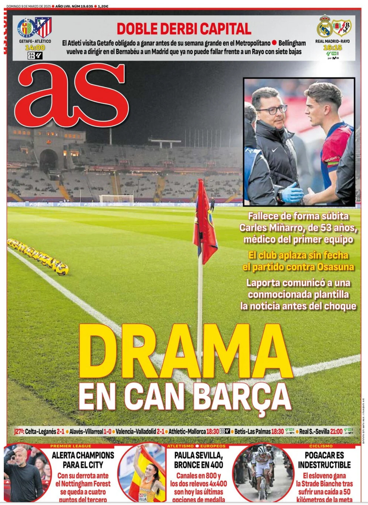 As publica que "fallece de forma súbita Carles Miñarro, de 53 años, médico del primer equipo. El Club aplaza sin fecha el partido contra Osasuna. Laporta comunicó a una conmocionada plantilla la noticia antes del choque".