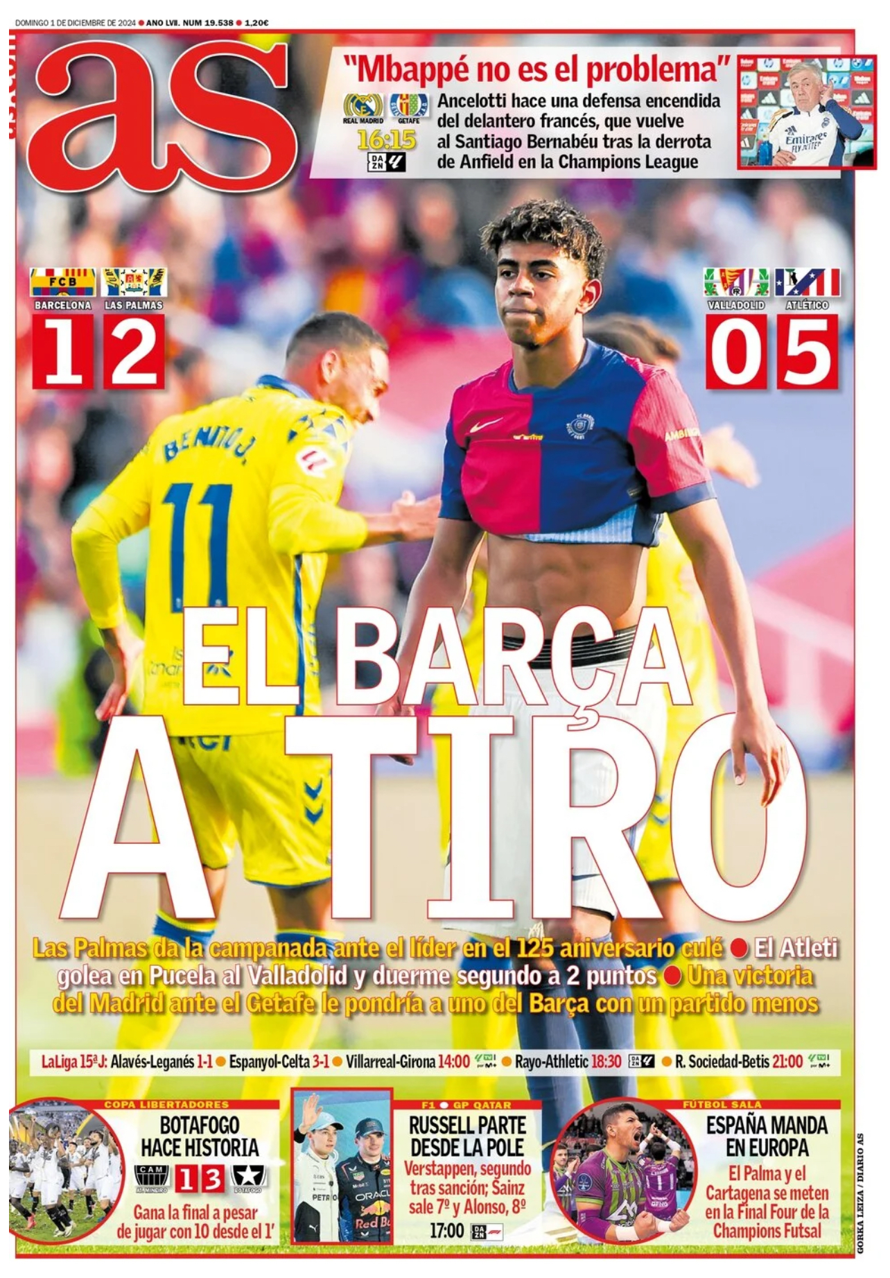 As apunta que "Las Palmas da la campanada ante el líder en el 125º Aniversario culé. El Atleti golea en Pucela al Valladolid y duerme segundo a 2 puntos. Una victoria del Madrid ante el Getafe le pondría a uno del Barça con un partido menos".