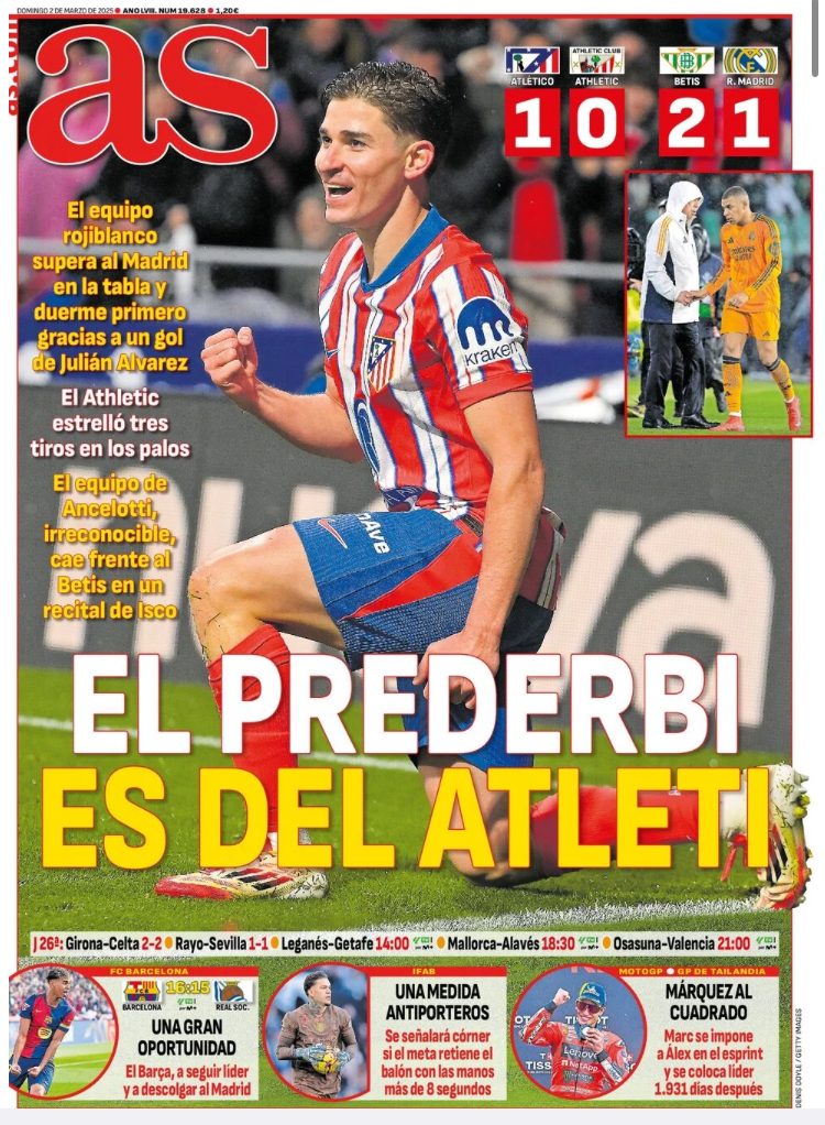 As apunta que el Atlético "supera al Madrid en la tabla y duerme primero gracias a un gol de Julián Álvarez. El Athletic estrelló tres tiros en los palos. El equipo de Ancelotti, irreconocible, cae frete al Betis en un recital de Isco".
