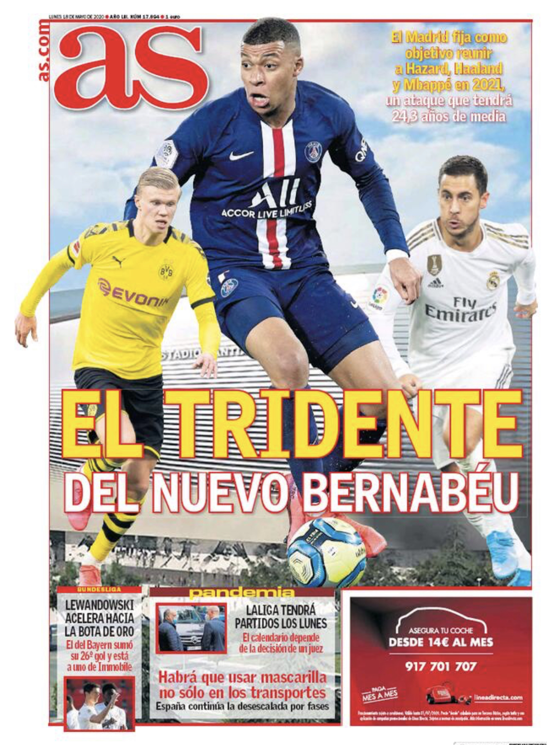 As publica en su portada que "el Madrid fija como objetivo reunir a Hazard, Haaland y Mbappé en 2021. Un ataque que tendrá 24,3 años de media", apunta el rotativo de la Capital.