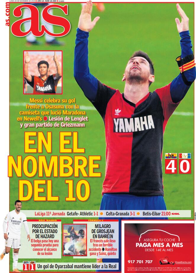 As también dedica su portada a Lionel Messi y Diego Maradona: "Messi celebra su gol frente a Osasuna con la camiseta que lució Maradona en Newell's. Lesión de Lenglet y gran partido de Griezmann".