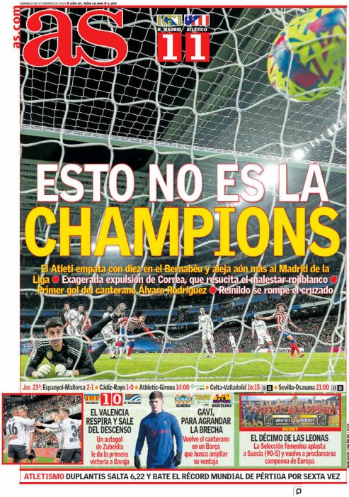As apunta que "el Atleti empata con diez en el Bernabéu y aleja aún más al Madrid de la Liga. Exagerada expulsión de Correa, que resucita el malestar rojiblanco. Primer gol del canterano Álvaro Rodríguez. Reinildo se rompe el cruzado".