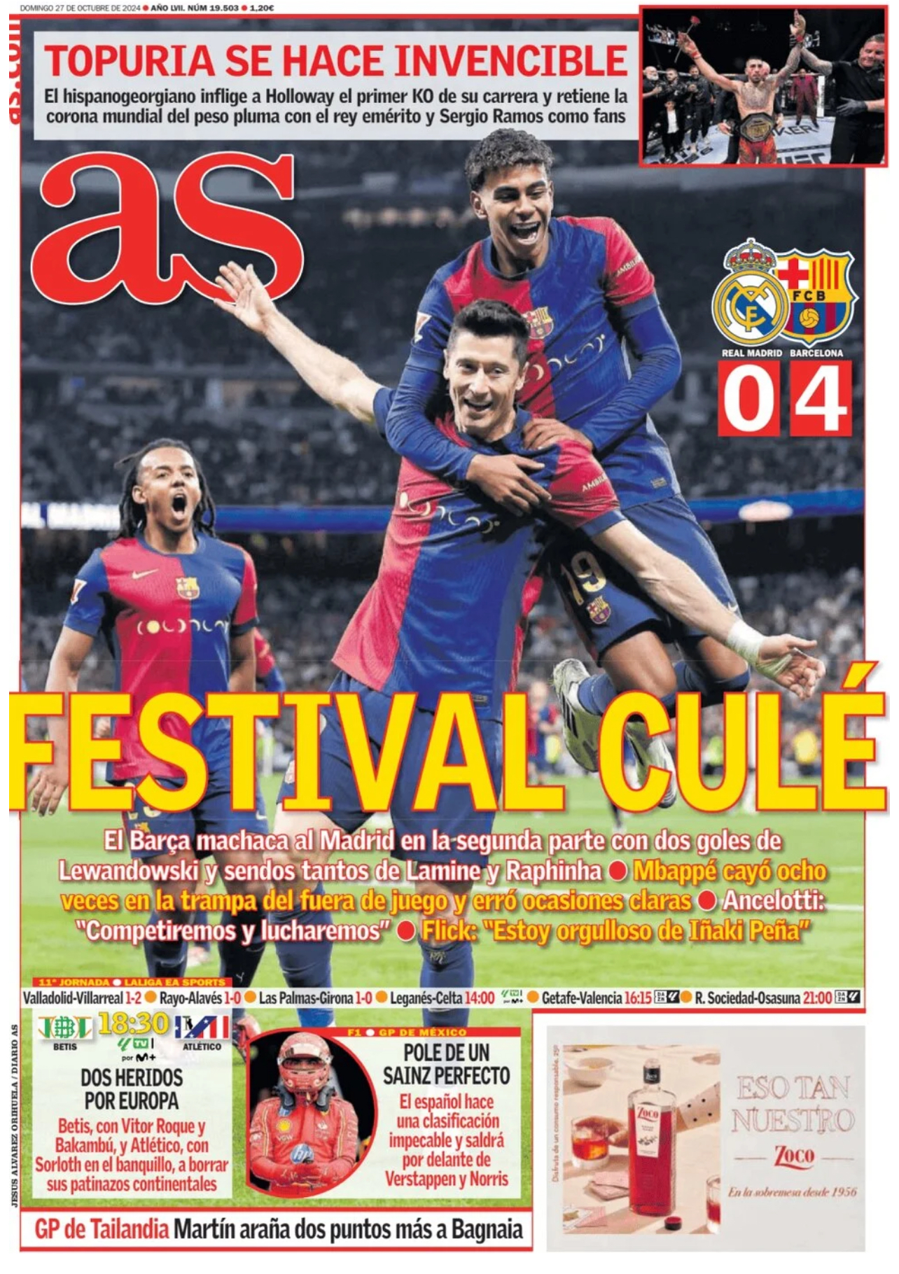 As apunta que "el Barça machaca al Madrid en la segunda parte con dos goles de Lewandowski y sendos tantos de Lamine y Raphinha. Mbappé cayó ocho veces en la trampa del fuera de juego y erró ocasiones claras".