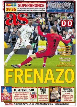 As publica que "una actuación soberbia de Remiro ralentiza la persecución del Madrid. Kubo convence al Bernabéu. El Barça ya es campeón de invierno".