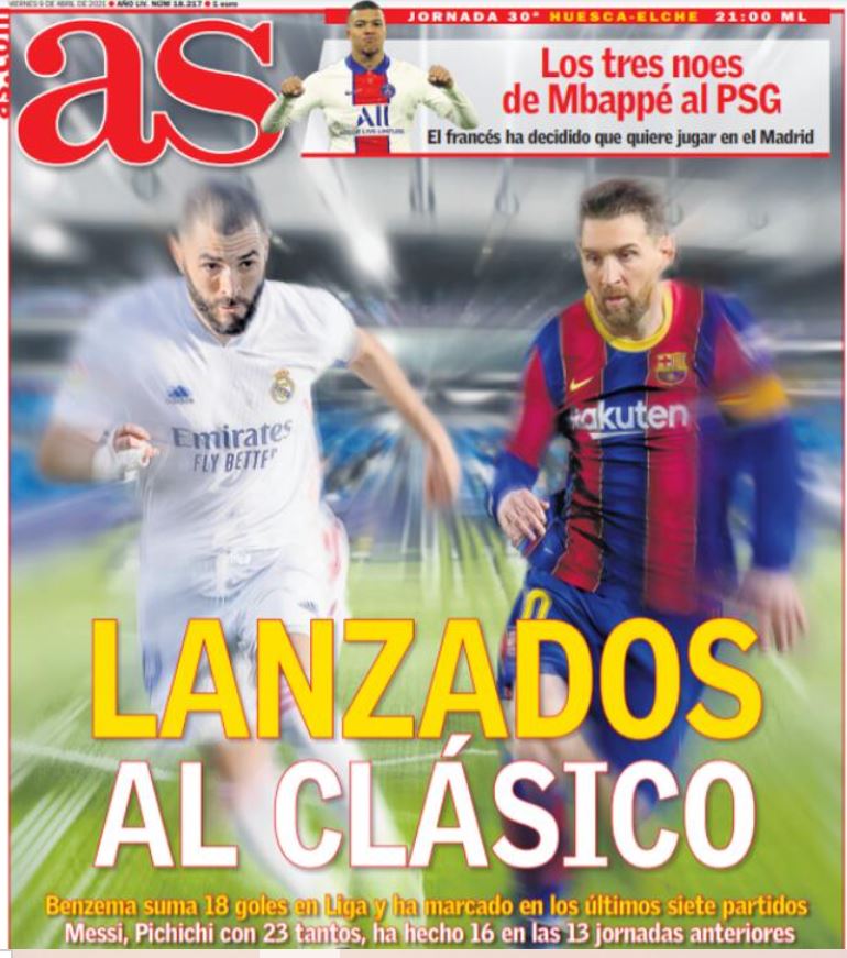 As, en vísperas del Madrid-Barça, publica que "Benzema suma 18 goles en Liga y ha marcado en los últimos siete partidos, Messi, Pichichi con 23 tantos, ha hecho 16 en las 13 jornadas anteriores".