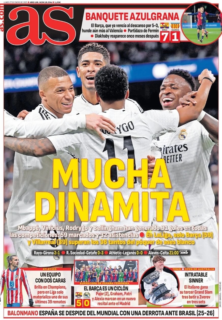 As apunta que "Mbappé, Vinícius, Rodrygo y Bellingham han generado 91 goles en todas las competiciones: 59 marcados y 32 asistencias. En La Liga, sólo Barça (59) y Villarreal (39) superan los 36 tantos del póquer de ases blanco".