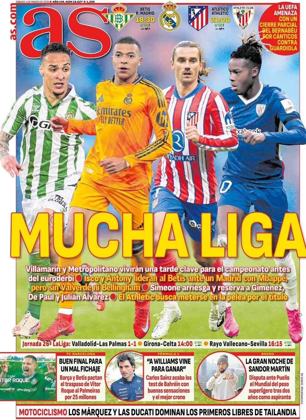 As publica que "Villamarín y Metropolitano vivirán una tarde clave para el campeonato antes del euroderbi. Isco y Antony lideran al Betis ante un Madrid con Mbappé pero sin Valverde ni Bellingham. Simeone arriesga y reserva a Giménez, De Paul y Julián Álvarez. El Athletic busca meterse en la pelea por el título".