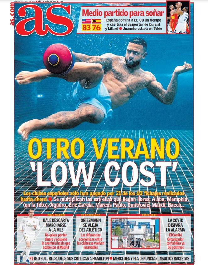 As resalta en su portada que "los clubes españoles sólo han pagado por 21 de los 60 fichajes realizados hasta ahora. Se multiplican las estrellas que llegan libres: Alaba, Memphis, Agüero, Eric García, Marcos Paulo, Dmitrovic, Mandi, Bacca...".