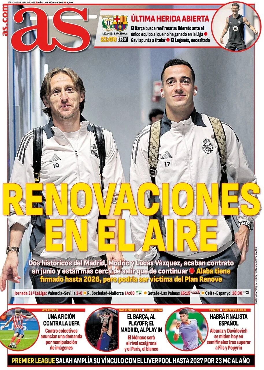 As apunta que "dos históricos del Madrid, Modric y Lucas Vázquez, acaban contrato en junio y están más cerca de salir que de continuar. Alaba tiene firmado hasta 2026 pero podría ser víctima del Plan Renove".