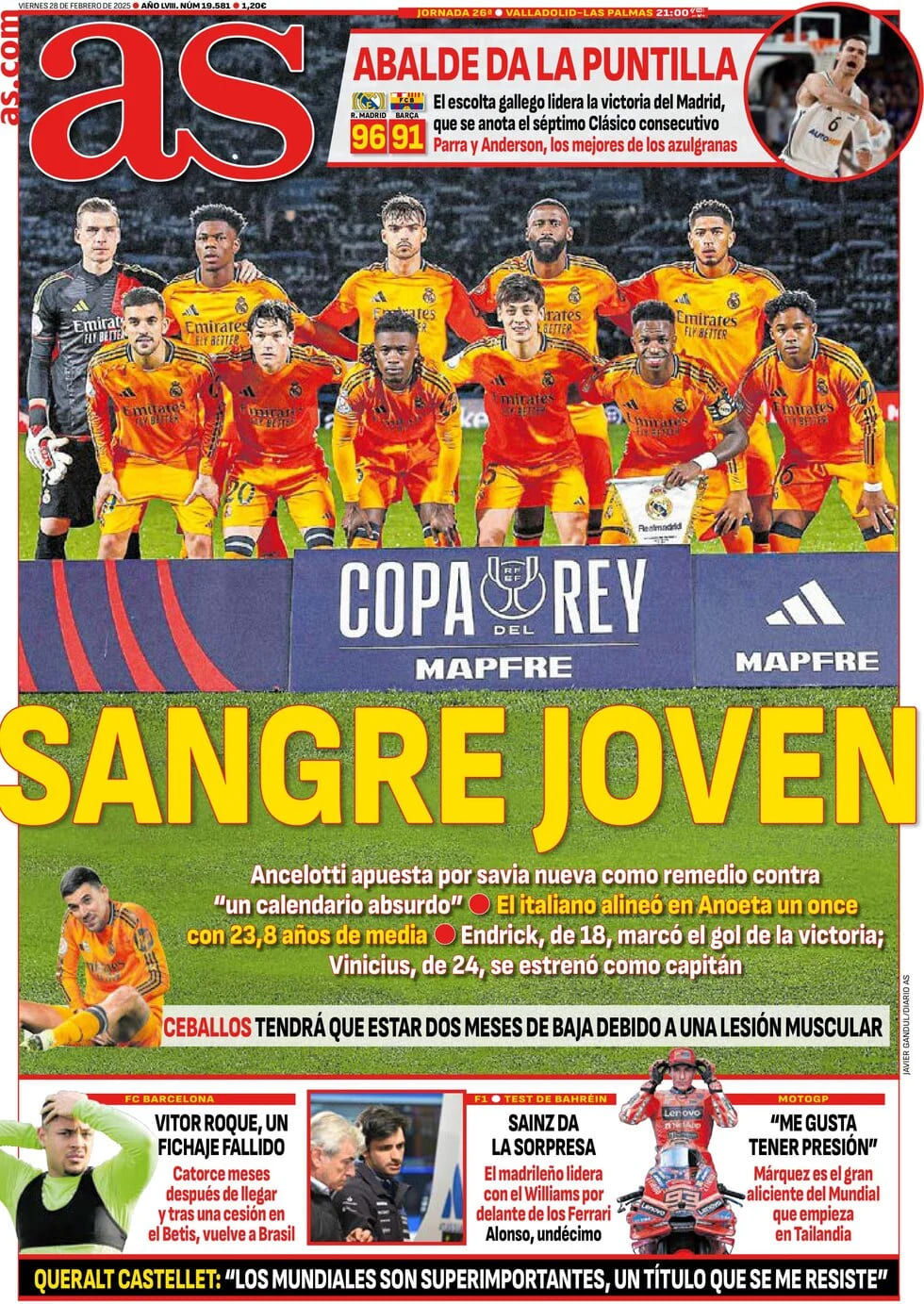 As publica que "Ancelotti apuesta por savia nueva como remedio contra "un calendario absurdo". El italiano alineó en Anoeta un once con 23,8 años de media. Endrick, de 18, marcó el gol de la victoria; Vinícius, de 24, se estrenó como capitán".