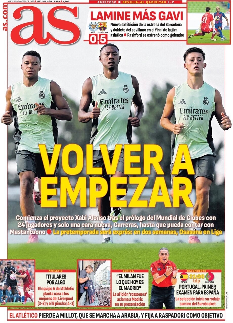 As publica que ''comienza el proyecto Xabi Alonso tras el prólogo del Mundial de Clubes con 24 jugadores y una sola cara nueva, Carreras, hasta que pueda contar con Mastantuono. La pretemporada será exprés, en dos semanas, Osasuna en Liga''.