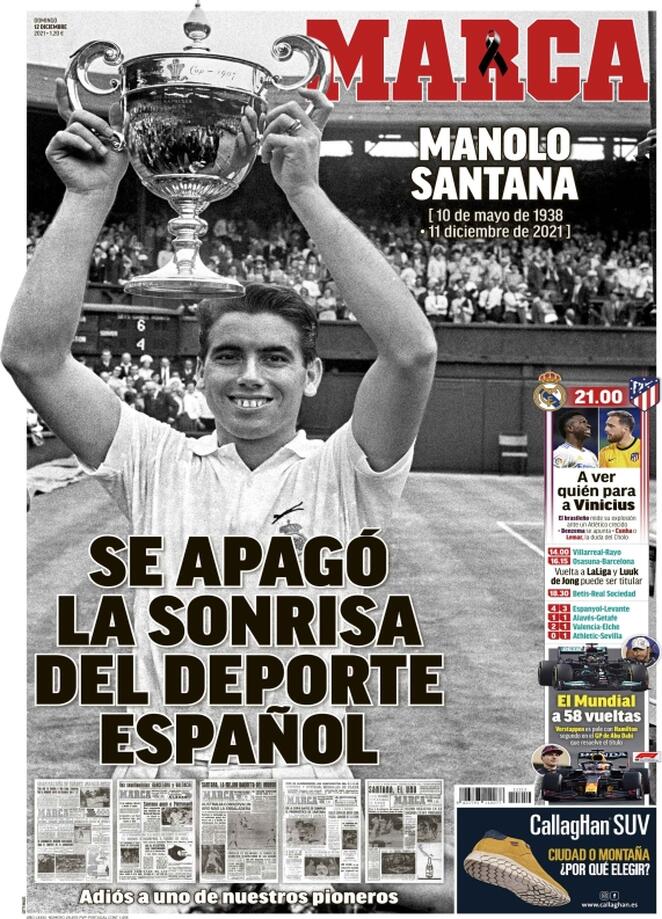 Marca dedica su portada a Manolo Santana, fallecido ayer. Respecto al fútbol, apunta que Vinícius Júnior "mide su explosión ante un Atlético crecido. Benzema se apunta, Cunha o Lemar la duda del Cholo".