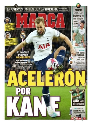 Marca apunta que "el Madrid prepara 80 millones" para la contratación de Kane, que "es el elegido para suplir a Benzema. El delantero del Tottenham da el OK. Havertz interesaba pero se cae del cartel".