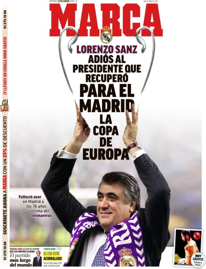 Marca dedica su portada a Lorenzo Sanz, ex presidente del Real Madrid fallecido ayer a los 76 años de edad víctima del coronavirus. Como dirigente recuperó para el club blanco la Copa de Europa después de una larga travesía en el desierto.