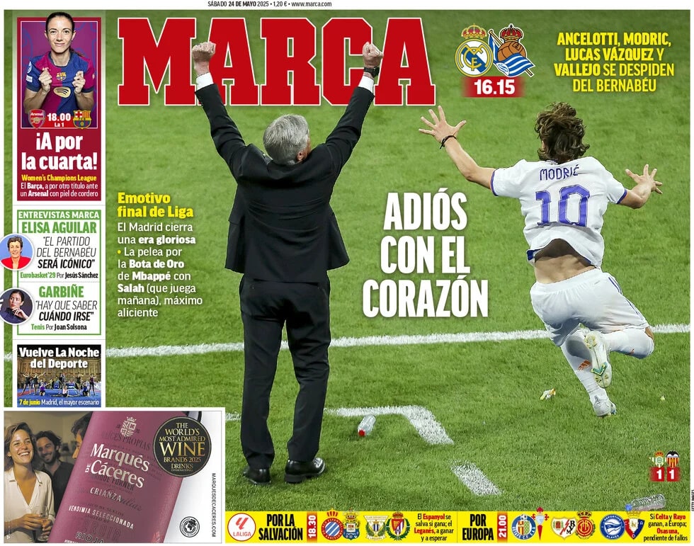 Marca dedica su portada a Carlo Ancelotti y Luka Modric, que junto a Lucas Vázquez y Vallejo se despiden del Bernabéu: "Emotivo final de Liga, el Madrid cierra una era gloriosa. La pelea por la Bota de Oro de Mbappé con Salah, que juega mañana, máximo aliciente"