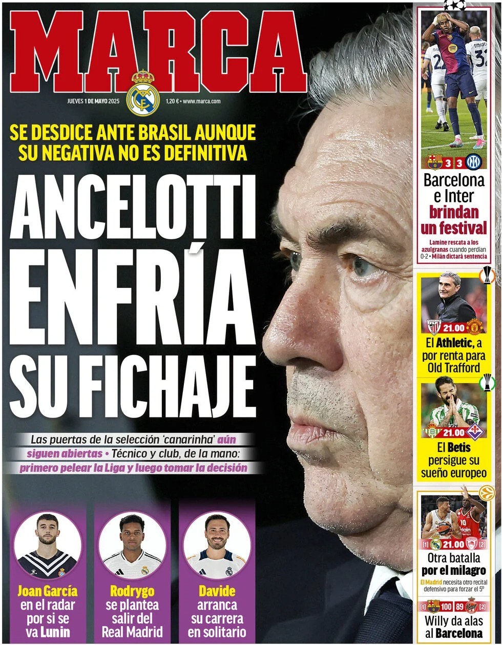 Marca apunta que Ancelotti "se desdice ante Brasil aunque su negativa no es definitiva. Las puertas de la Selección 'Canarinha' aún siguen abiertas. Técnico y Club, de la mano: primero pelear la Liga y luego tomar la decisión".