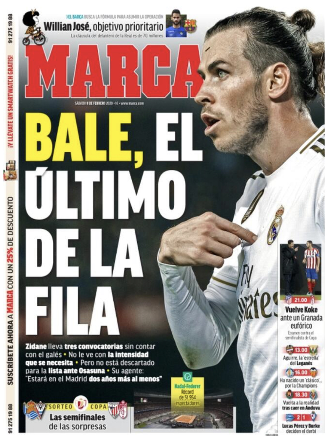 Marca dedica su portada a Gareth Bale: "Zidane lleva tres convocatorias sin contar con el galés, no lo ve con la intensidad que se necesita, pero no está descartado para la lista ante Osasuna", apunta el diario.