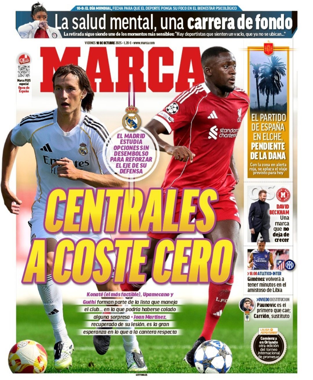 Marca apunta que "el Madrid estudia opciones sin desembolso para reforzar el eje de su defensa. Konaté, el más factible, Upamecano y Guehi forman parte de la lista que maneja el club... en la que podría haberse colado alguna sorpresa. Joan Martínez, recuperado de su lesión, es la gran esperanza en lo que a la Cantera respecta"
