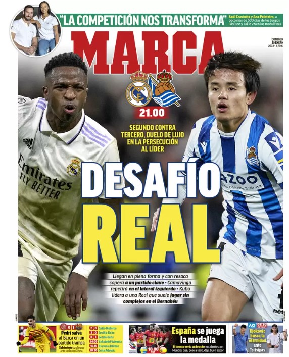 Marca dedica su portada al Real Madrid - Real Sociedad de esta noche: "Segundo contra tercero, duelo de lujo en la persecución al líder. Llegan en plena forma y con resaca copera a un partido clave. Camavinga repetirá en el lateral izquierdo. Kubo lidera a una Real que suele jugar sin complejos en el Bernabéu".