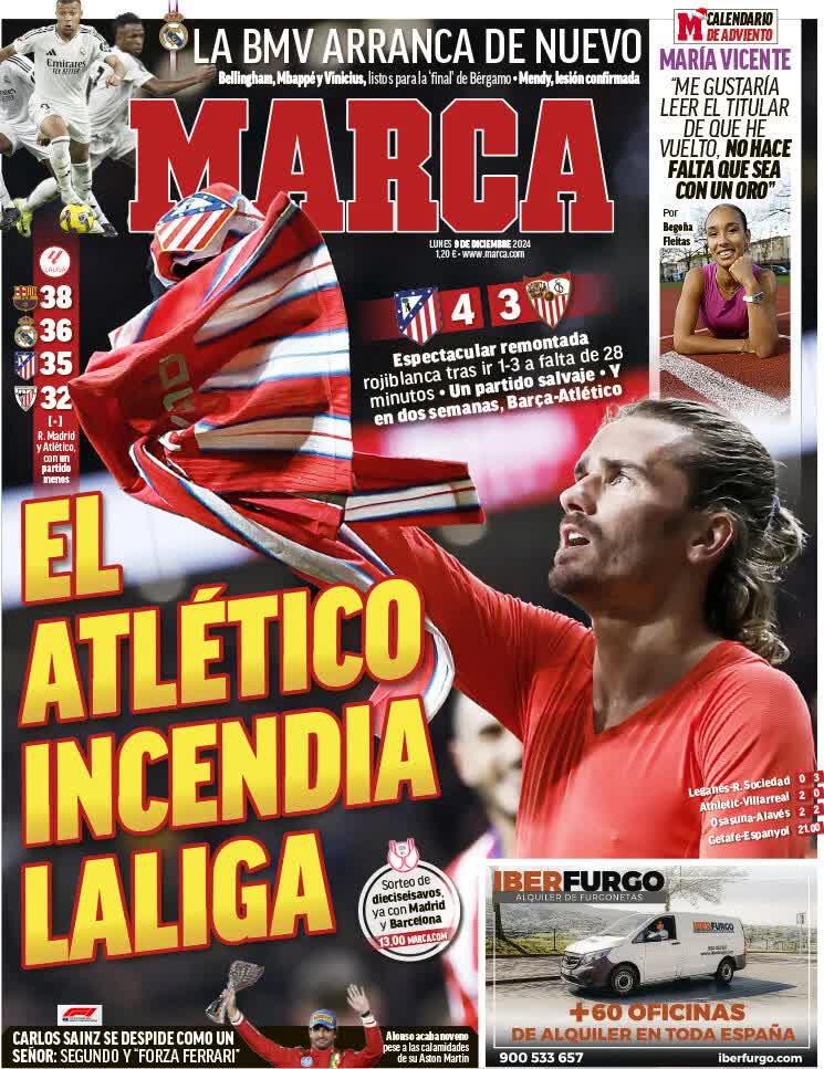 Marca dedica la parte principal de su portada a la victoria del Atlético ante el Sevilla: "Espectacular remontada rojiblanca tras ir 1-3 a falta de 28 minutos. Un partido salvaje. Y en dos semanas, Barça - Atlético".