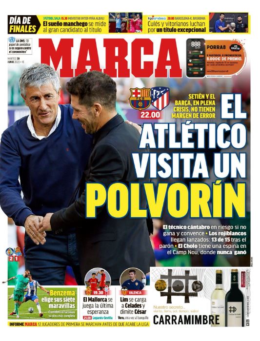 Marca apunta que "Setién en riesgo si no gana y convence. Los rojiblancos llegan lanzados, 13 de 15 tras el parón. El Chjolo tiene una espina en el Camp Nou, donde nunca ganó".