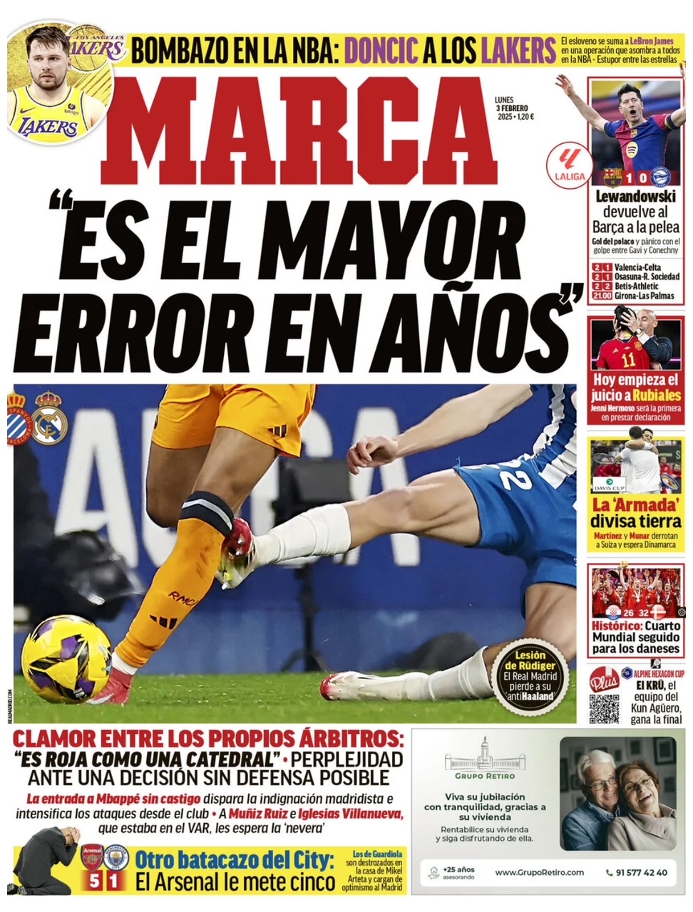 Marca alude en su portada a un "clamor entre los propios árbitros" por la no expulsión de Romero por su entrada a Mbappé en el Espanyol - Real Madrid. "Es roja como una catedral, perplejidad ante una decisión sin defensa posible. A Muñiz Ruiz e Iglesias Villanueva les espera la 'nevera'", agrega el rotativo.