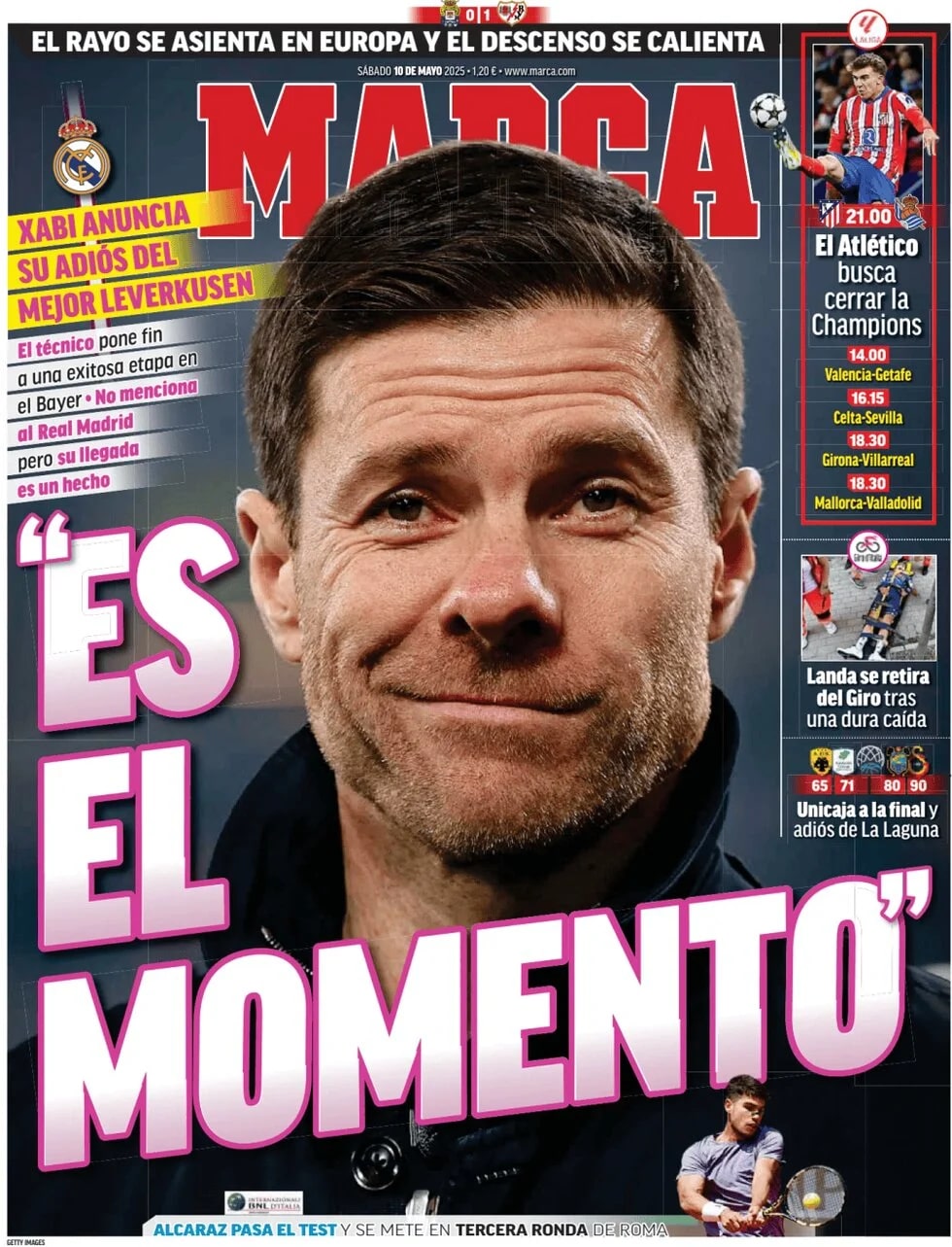 Marca dedica su portada a Xabi Alonso y el anuncio de su salida del Bayer Leverkusen al final de esta temporada: "El técnico pone fin a una exitosa etapa en el Bayer. No menciona al Real Madrid pero su llegada es un hecho".