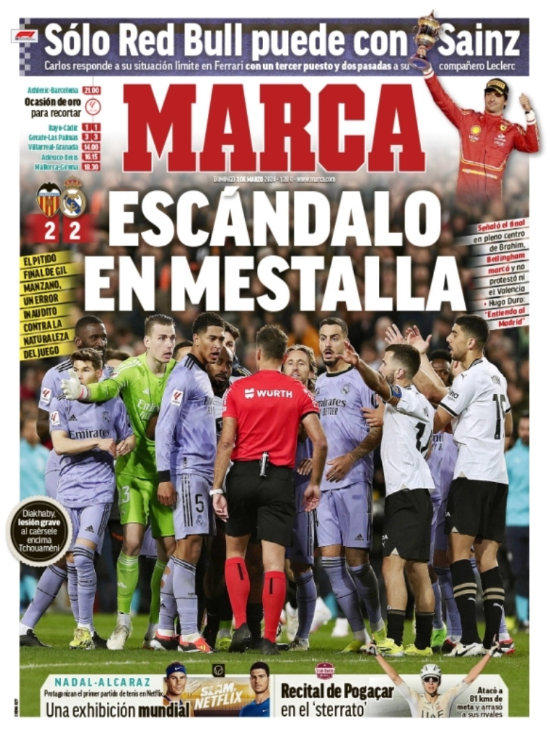 Marca apunta que "el pitido final de Gil Manzano, un error inaudito contra la naturaleza del juego. Señaló el final en pleno centro de Brahim. Bellingham marcó y no protestó ni el Valencia".