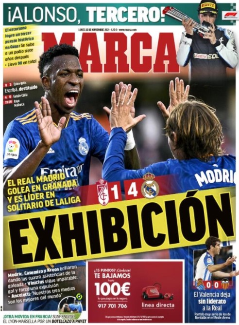 Marca apunta que "el Real Madrid golea en Granada y es líder en solitario de la Liga. Modric, Casemiro y Kroos brillaron dando las cuatro asistencias de la goleada. Vinícius sigue imparable: gol y forzó una expulsión".
