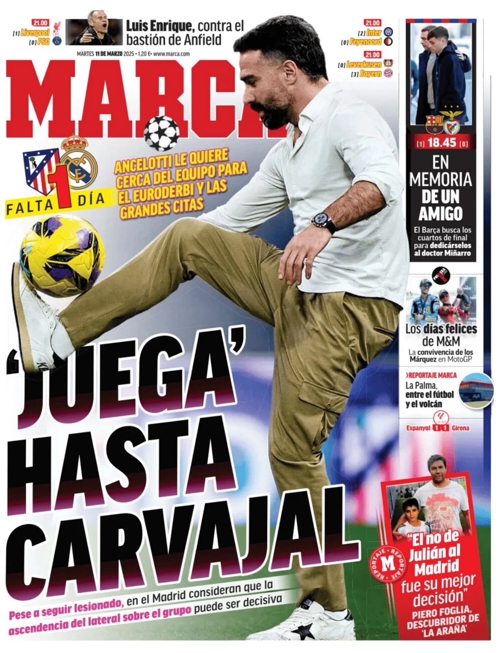 Marca apunta que "pese a seguir lesionado, en el Madrid consideran que la ascendencia de Carvajal en el grupo puede ser decisiva. Ancelotti le quiere cerca del equipo para el Euroderbi y las grandes citas".
