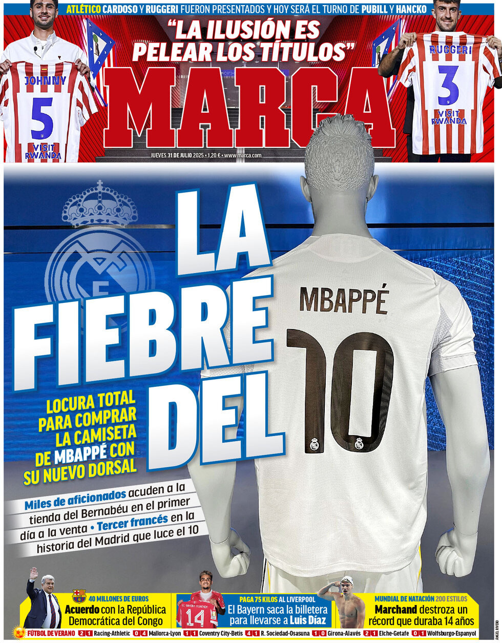 Marca destaca la ''locura total para comprar la camiseta de Mbappé con el nuevo dorsal. Miles de aficionados acuden a la tienda del Bernabéu en el primer día a la venta''.