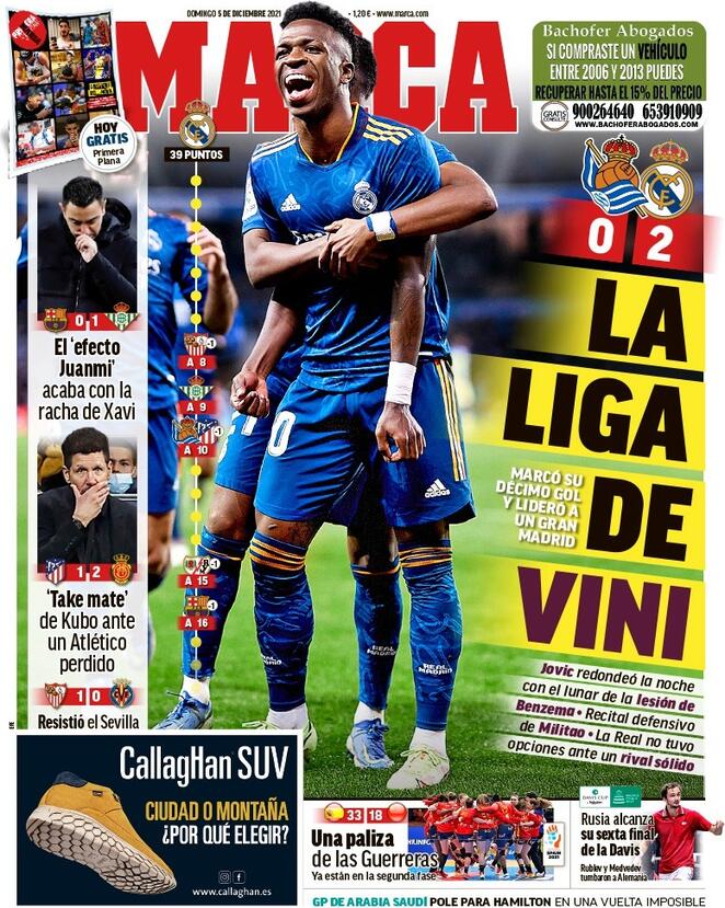 Marca dedica su portada a Vinícius Júnior: "Marcó su décimo gol y lideró a un gran Madrid. Jovic redondeó la noche con el lunar de la lesión de Benzema. Recital defensivo de Militao".