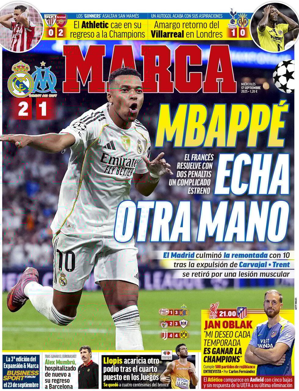 Marca apunta que Kylian Mbappé "resuelve con dos penaltis un complicado estreno. El Madrid culminó la remontada con 10 tras la expulsión de Carvajal. Trent se retiró tras una lesión muscular".