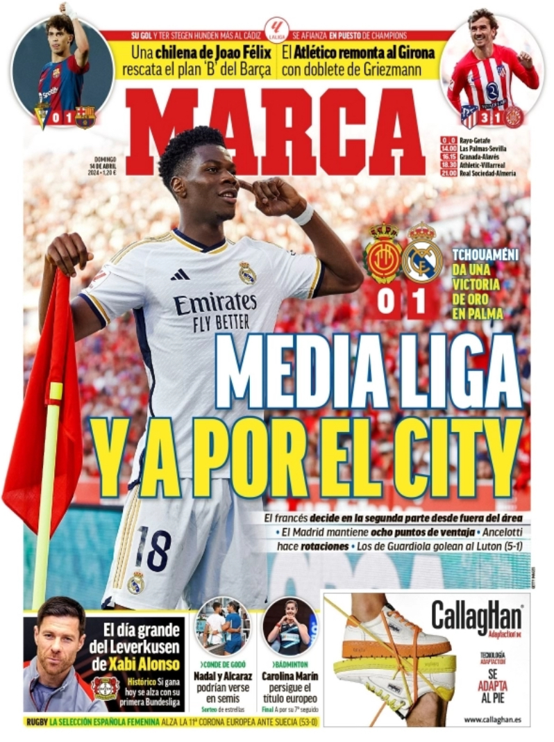 Aurélien Tchouaméni es protagonista de la portada de Marca: "El francés decide en la segunda parte desde fuera del área. El Madrid mantiene ocho puntos de ventaja. Ancelotti hace rotaciones. El City golea al Luton (5-1).