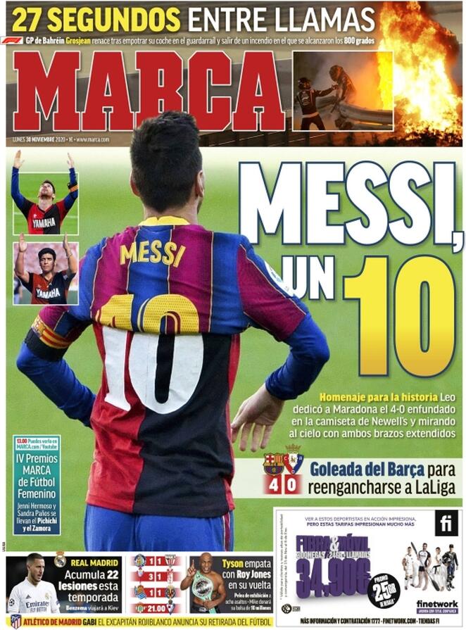 Marca también destaca en su portada el gesto de Lionel Messi en homenaje a Diego Maradona: "Leo dedicó a Maradona el 4-0 enfundado en la camiseta de Newell's y mirando al cielo con ambos brazos extendidos".