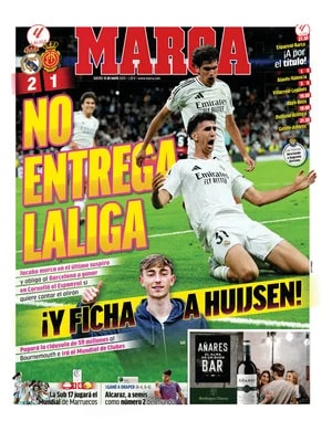 Marca apunta que "Jacobo marca en el último suspiro y obliga al Barcelona a ganar en Cornellà al Espanyol si quiere cantar el alirón". El rotativo agrega que el Real Madrid "pagará la cláusula de 59 millones al Bournemouth y Huijsen irá al Mundial de Clubes".