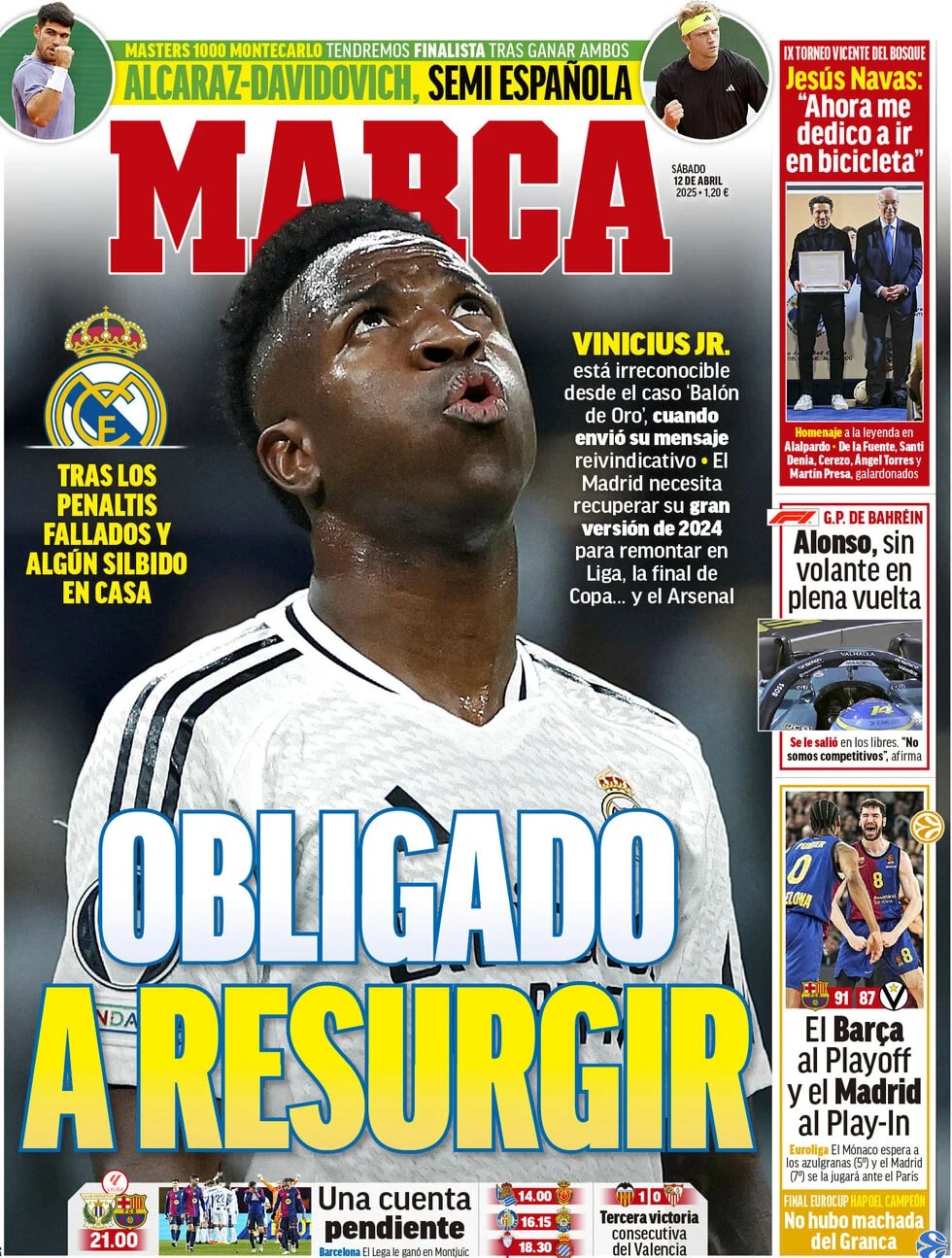 Vinícius Júnior es protagonista de la portada de Marca: "Está irreconocible desde el caso 'Balón de Oro' cuando envió su mensaje reivindicativo. El Madrid necesita recuperar su gran versión de 2024 para remontar en Liga, la final de Copa... y el Arsenal".
