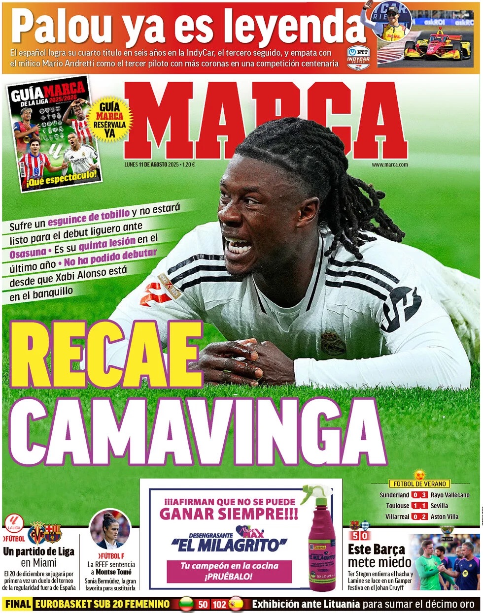 Marca destaca en su portada que Camavinga "sufre un esguince de tobillo y no estará listo para el debut liguero ante Osasuna. Es su quinta lesión en el último año. No ha podido debutar desde que Xabi Alonso está en el banquillo".
