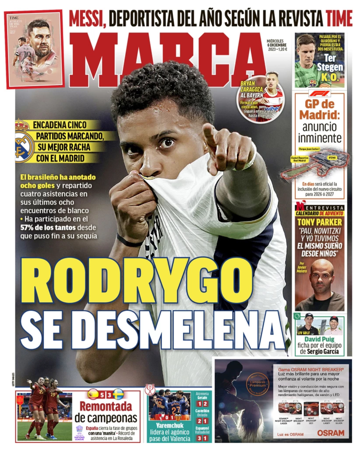 Marca apunta en su portada que Rodrygo "ha anotado ocho goles y repartido cuatro asistencias en sus últimos ocho encuentros de blanco. Ha participado en el 57 por ciento de los tantos desde que puso fin a su sequía".