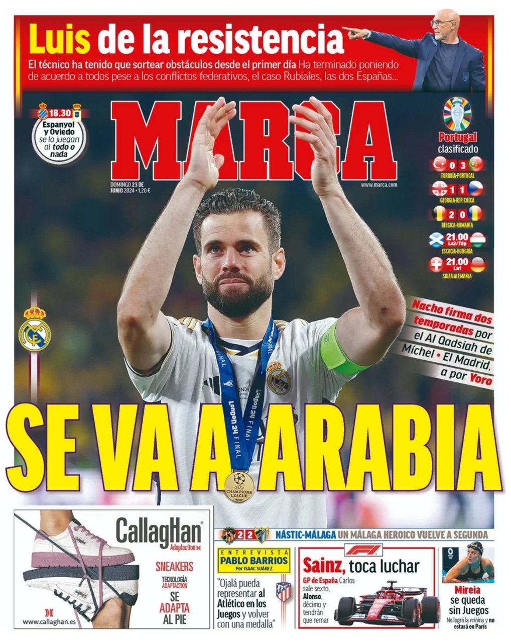 Nacho es protagonista de la portada de Marca: "Firma dos temporadas por el Al-Qadsiah de Michel. El Madrid, a por Yoro". Espacio para Luis de la Fuente y su resistencia ante los inconvenientes.