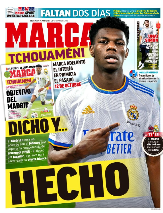 Marca apunta en su portada que "el Madrid cierra un acuerdo con el Monaco tras supera la competencia de Liverpool y PSG por Tchouaméni. El deseo del jugador, decisivo para hacer valer la oferta blanca".