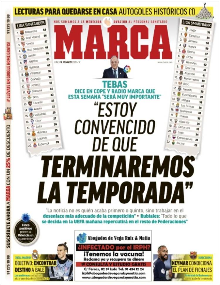 Marca destaca en su portada las palabras de Javier Tebas sobre un posible regreso a la actividad del fútbol profesional en España: "La noticia no es quién acaba primero o quinto, sino trabajar en el desenlace más adecuado de la competición", las palabras del presidente de la Patronal.