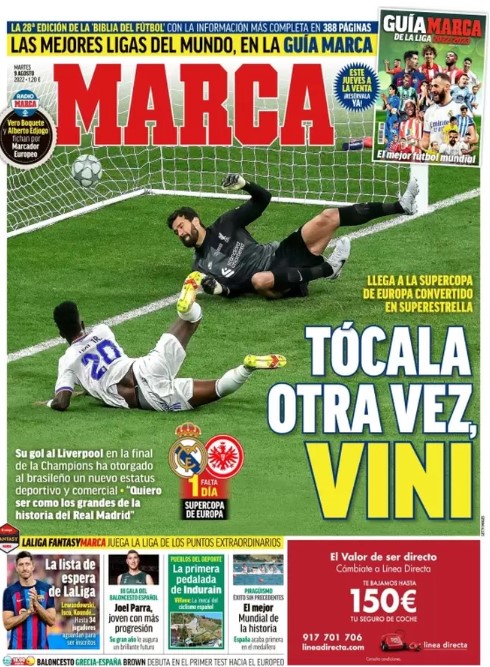 Marca dedica su portada a Vinícius Júnior: "Su gol al Liverpool en la final de la Champions ha otorgado al brasileño un nuevo estatus deportivo y comercial". Agrega una de sus frases: "Quiero ser como los grandes de la historia del Real Madrid".