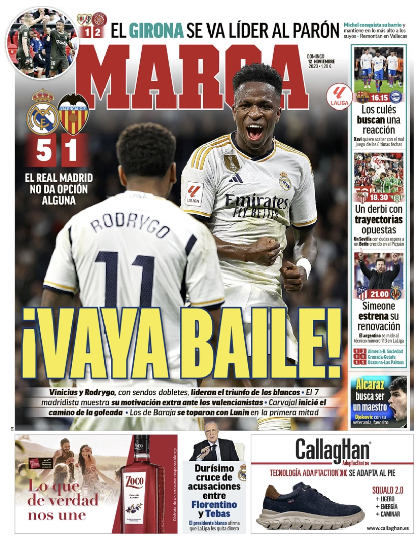 Marca publica que "Vinícius y Rodrygo, con sendos dobletes, lideran el triunfo de los blancos. El 7 madridista muestra su motivación extra ante los valencianistas. Carvajal inició el camino de la goleada. Los de Baraja se toparon con Lunin en la primera mitad".