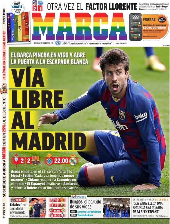 Marca también resalta en su portada el paso en falso del FC Barcelona en Vigo: "Aspas empata en el 88 con una falta a lo Messi. Zidane recupera a Casemiro en el medio. El Espanyol destituye a Abelardo y coloca a Rufete en su final por la salvación".